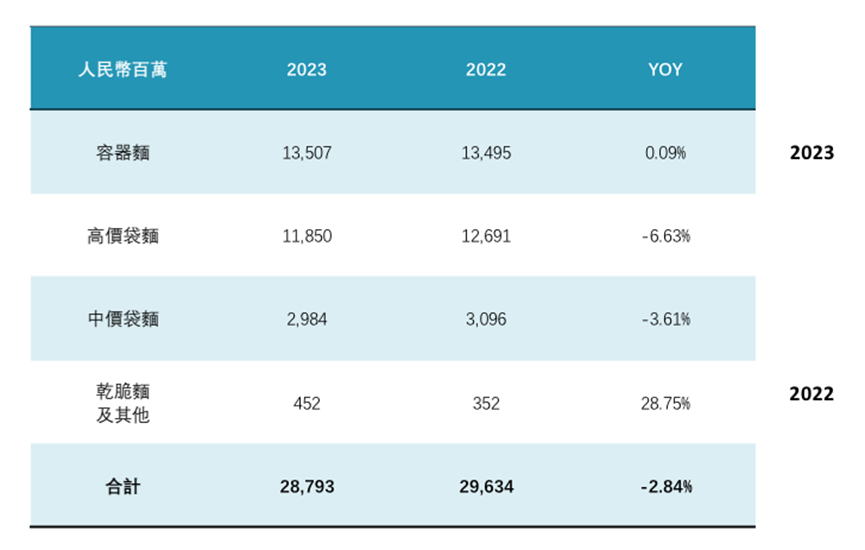 然而,遺憾的是,高價面并未俘獲更多消費者。財報顯示,2023年,康師傅高價袋面以及中價袋面營收分別為118.5億元以及29.84億元,分別同比下滑6.63%以及3.61%。