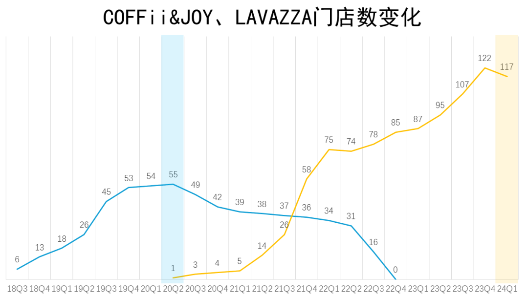 彼時(shí)坊間認(rèn)為,百勝中國(guó)平價(jià)的K咖啡、精品的COFFii&JOY和高端咖啡Lavazza將共同布局咖啡市場(chǎng)。但從門店?duì)顩r看,2020年第二季度Lavazza開出門店后,COFFii&JOY的門店規(guī)模就持續(xù)縮水,直到2022年第四季度完全淡出。