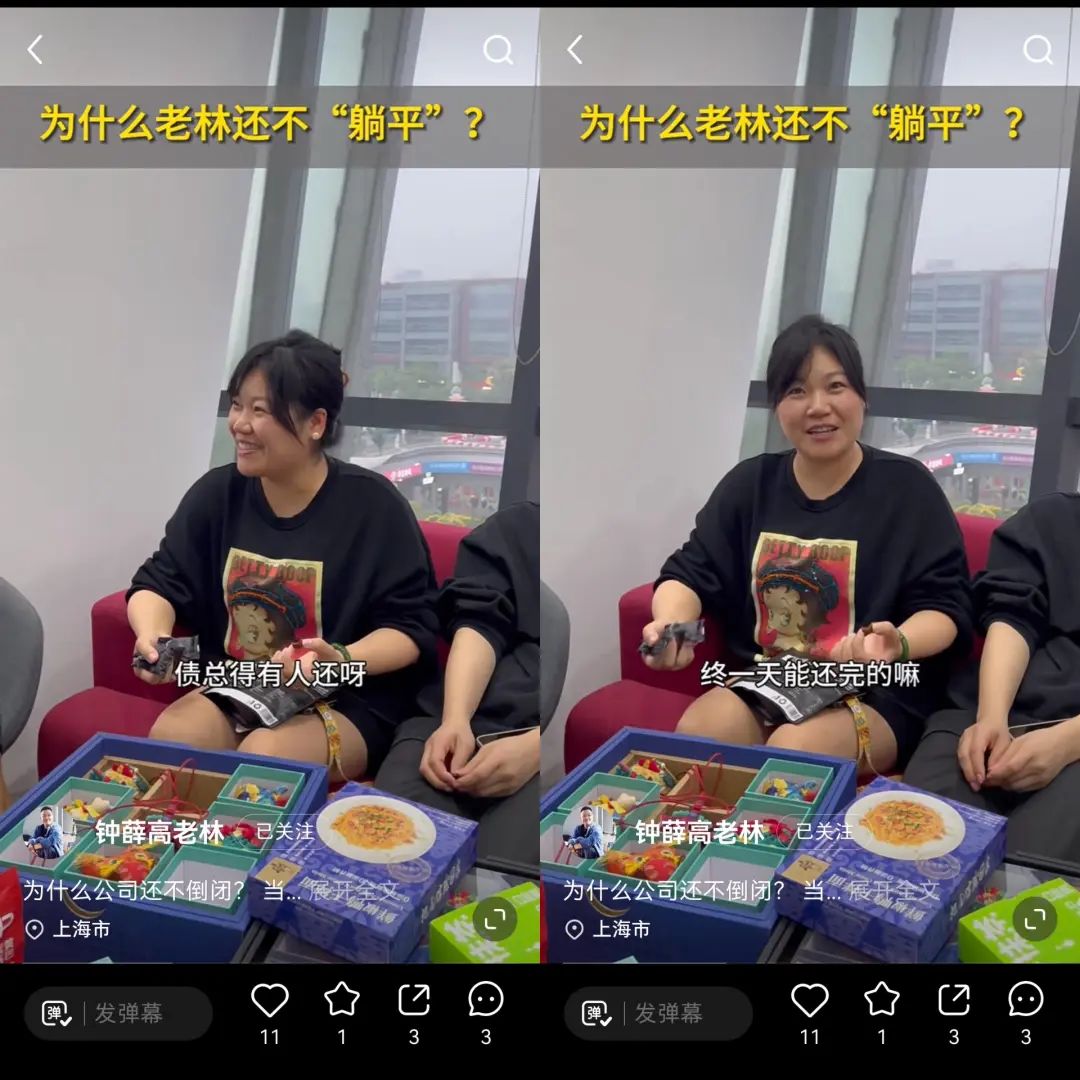 6月1日,在鐘薛高創(chuàng)始人林盛的視頻中,選擇留下的鐘薛高員工一邊參與直播間選品,一邊回答著“老林為什么不‘躺平’”這個問題。