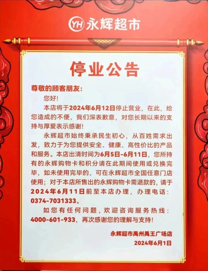 聯(lián)商快訊:繼永輝超市許昌萬達(dá)廣場(chǎng)店停業(yè)后,永輝超市禹州店也發(fā)布了停業(yè)公告,該店將于6月12日停止?fàn)I業(yè)。