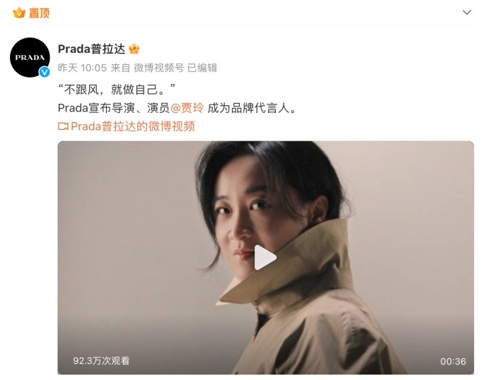 6月2日,意大利奢侈品牌Prada官宣賈玲為代言人,并稱其是“中國國民度最高的演員之一”。在宣傳視頻中,賈玲提到了她對影視創(chuàng)作和時裝的態(tài)度,核心口號是“不跟風(fēng),就做自己”。