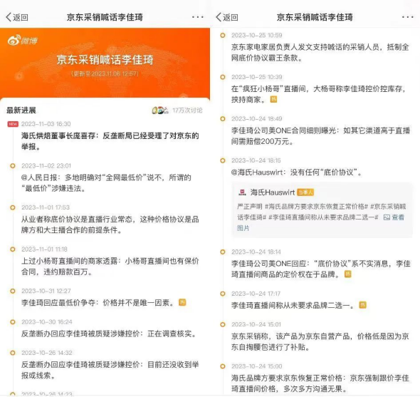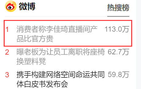 2022年雙十一大促期間,因據(jù)多位消費者反饋,10月24日通過李佳琦直播間購買了到手價格1240元的悅薇水乳套裝,然而11月4日凌晨,天貓資生堂官方旗艦店直播間開賣的同款悅薇水乳套裝,領(lǐng)取店鋪發(fā)放的優(yōu)惠券后只需888元,比李佳琦直播間便宜350多元。相差巨大的產(chǎn)品價格,使得針對李佳琦直播間的輿論快速發(fā)酵,11月7日晚間,話題#消費者稱李佳琦直播間產(chǎn)品比官方貴#登上微博熱搜第一,期間閱讀量曾超過5億、討論量超過3萬。