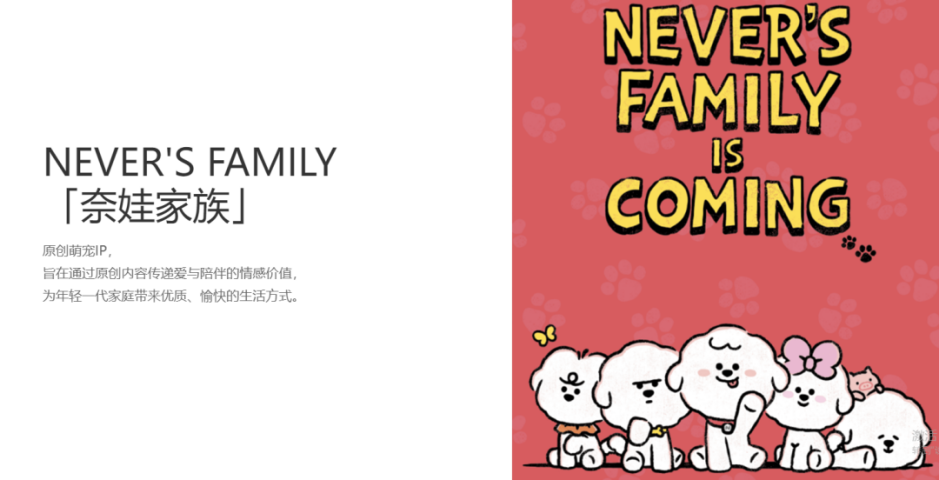 作為美ONE旗下?lián)碛袕V泛粉絲且極具吸金力的IP之一,“奈娃家族”NEVER 早在2020年就曾與完美日記聯(lián)名推出眼影“小狗盤”,僅一分鐘就賣出十萬件;同年,美ONE自制的《奈娃家族的上學(xué)日記》治療犬培訓(xùn)綜藝上線,全網(wǎng)播放量達2億,收割無數(shù)粉絲喜愛。此外,奈娃家族在天貓官旗上線首日,還創(chuàng)下行業(yè)銷售額新高。在美ONE的精心策劃下,目前奈娃家族聯(lián)名已遍布多領(lǐng)域,逐步釋放商業(yè)價值。