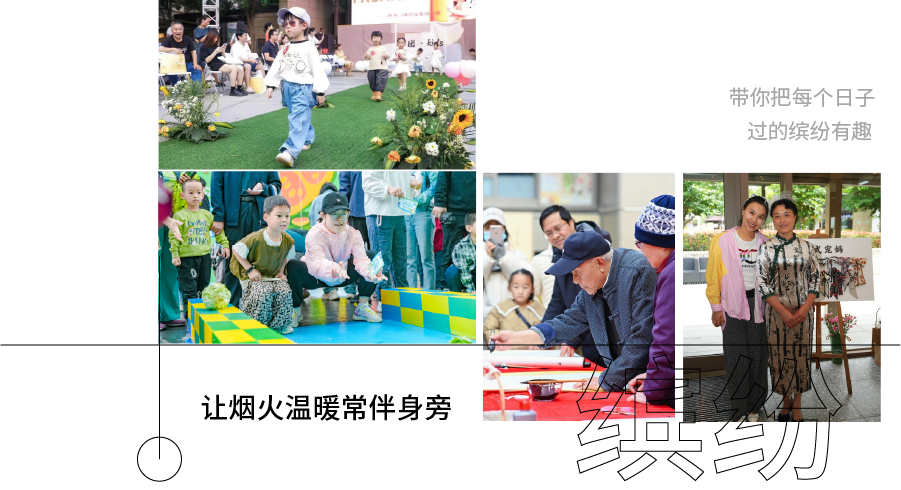 繽紛里基于大量的老人和孩童客群,通過“尊老愛幼”的童趣和公益活動,刷新社區(qū)親子家庭和頤樂養(yǎng)老的生活方式。這里開展了“爭菜運(yùn)動會”、“蔬菜物語”、“王者開黑”、“潮辣舞藝”、“小鎮(zhèn)十二時辰,煙花璀璨”等出圈活動。在繽紛里, 孩童們嬉笑打鬧、年輕人社交聚友、寶媽們組團(tuán)遛娃、長者們嘮嗑健身, 甚至居民們集會、表演,都能找到合適的去處。