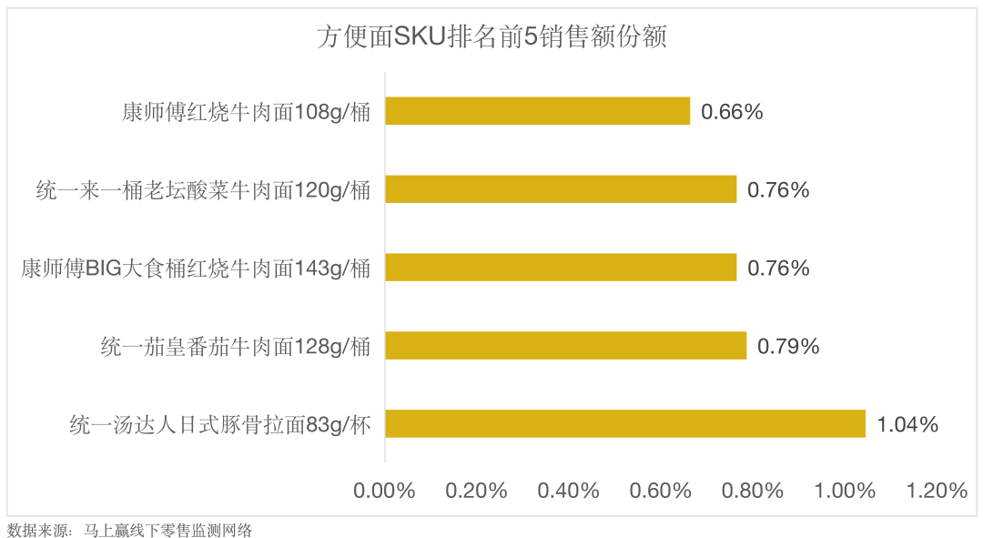 統(tǒng)一湯達人系列是這方面的一個典型產(chǎn)品。這款產(chǎn)品強調(diào)使用真材實料熬制湯底,減少添加劑,試圖吸引追求健康飲食的消費者,但價格會比康師傅的經(jīng)典款貴上1-4元。根據(jù)「馬上贏」提供的數(shù)據(jù),方便面的各類單品當中,銷售額排名第一的是統(tǒng)一湯達人日式豚骨拉面。