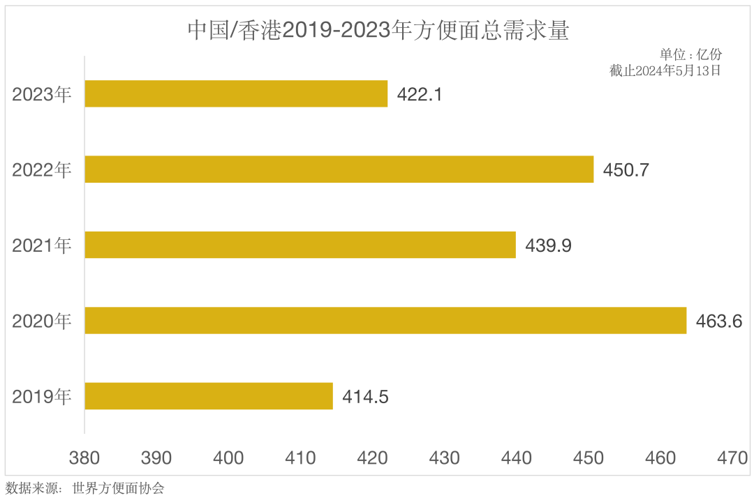 2019年方便面開始出現(xiàn)整體銷量下滑,2020年或是封控原因,方便面銷量有所回升,但這也是迄今為止5年內(nèi),數(shù)據(jù)最高的一次。或許卻是突如其來的疫情,方便面成為了大家瘋狂囤貨的必需品,甚至一度成為了“硬通貨”。2020-2022年方便面需求量的波動,多少與當時社會面臨的公共衛(wèi)生整體環(huán)境有關(guān),疫情防控反反復(fù)復(fù),也導(dǎo)致大家對方便面的儲備決定反反復(fù)復(fù)。