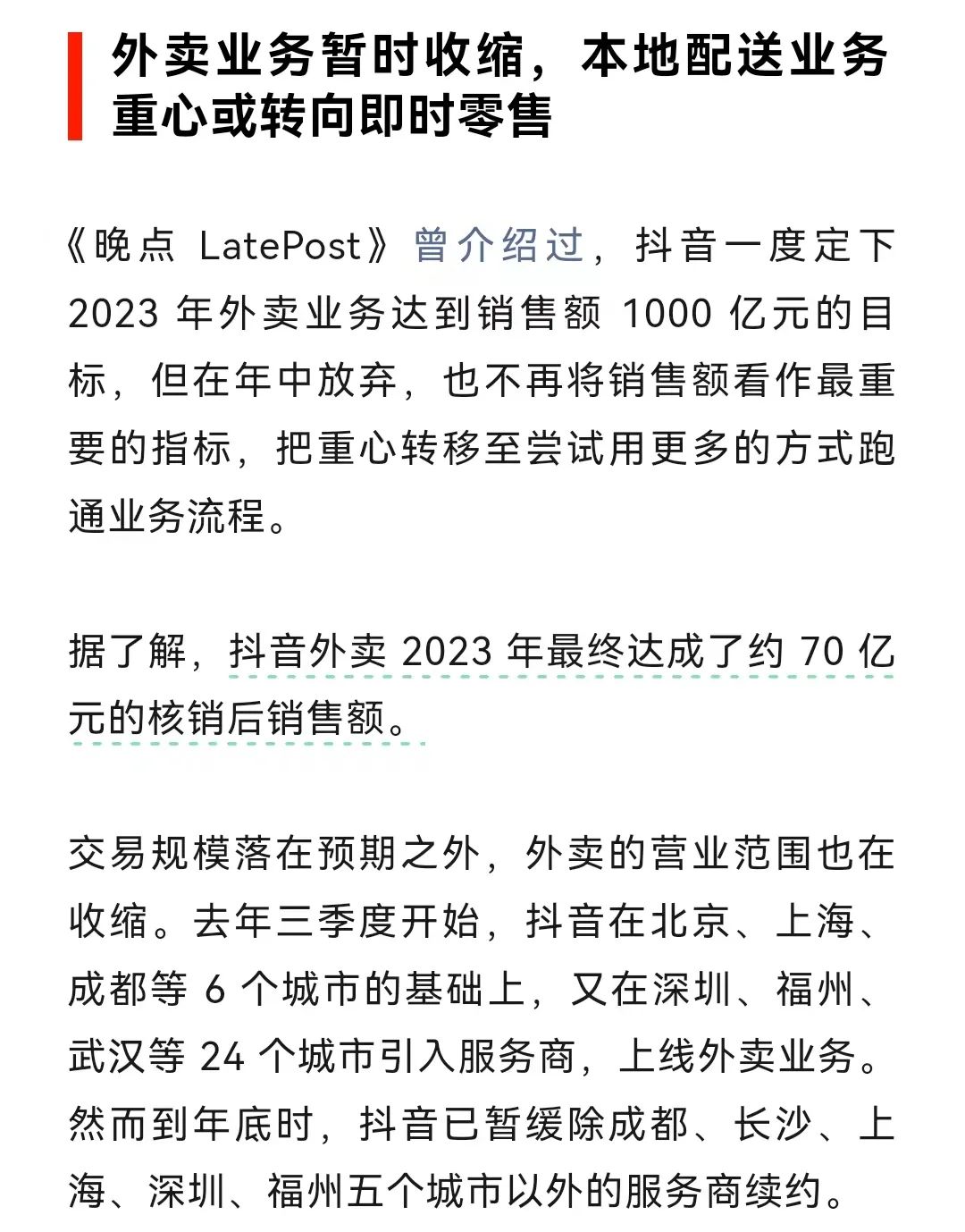 據(jù)晚點LatePost,抖音外賣2023年最終達成了約70億元的核銷后銷售額。知情人士透露,抖音外賣業(yè)務暫時收縮,未來抖音在本地配送業(yè)務重心或轉(zhuǎn)向即時零售。