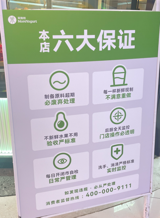 氫消費(fèi)在茉酸奶門店看到,此輪風(fēng)波過(guò)后,茉酸奶門店給顧客推出了六大承諾,針對(duì)水果變質(zhì)問(wèn)題和店員操作規(guī)范問(wèn)題都進(jìn)行了針對(duì)性回復(fù)。