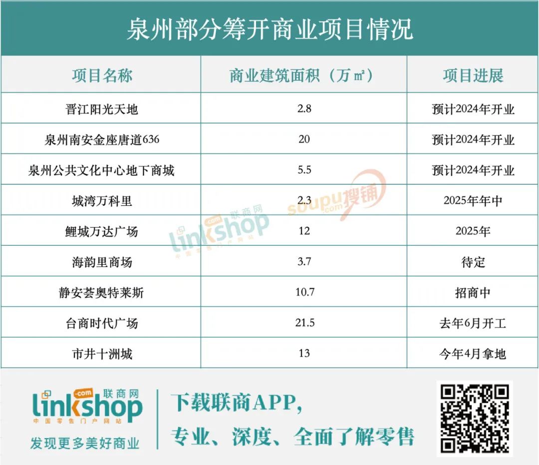 《聯(lián)商網(wǎng)》統(tǒng)計了目前泉州在建和籌開的商業(yè)情況,2024年以后至少有9個商業(yè)體將開業(yè),新增存量近百萬方。晉江陽光天地、泉州南安金座唐道636、泉州公共文化中心地下商城等項目預(yù)計在2024年亮相,其他如鯉城萬達廣場、臺商時代廣場、靜安薈奧特萊斯等目前也在積極籌備中。