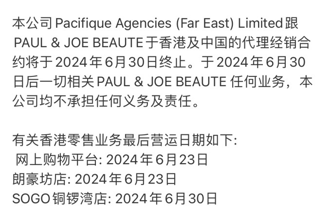 此外,聲明指出PAUL &JOE BEAUTE與品牌代理經(jīng)銷商Pacifique Agencies(Far East)Limited,將于6月底結(jié)束與品牌在香港地區(qū)及中國大陸地區(qū)的合約。PAUL&JOE香港官網(wǎng)商城和香港旺角朗豪坊線下門店的最后運(yùn)營時(shí)間為6月23日,SOGO香港銅鑼灣門店的最后運(yùn)營時(shí)間為6月30日。