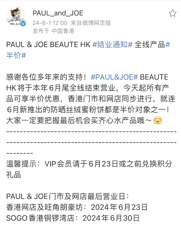 6月1日,PAUL&JOE官方微博發(fā)布聲明稱PAUL&JOE BEAUTE香港線下門店及香港官網(wǎng)將于6月末結(jié)束營業(yè)。