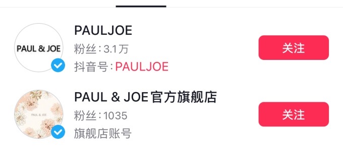 值得注意的是,PAUL&JOE在抖音上還有另外一個(gè)旗艦店賬號,目前僅發(fā)布4個(gè)作品,該運(yùn)營主體是日本“健康水”Albion奧爾濱的關(guān)聯(lián)公司奧碧虹(上海)化妝品貿(mào)易有限公司。