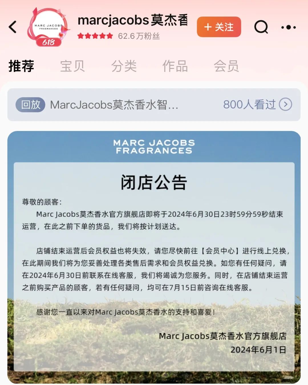 近日,Marc Jacobs莫杰香水官方天貓旗艦店發(fā)布閉店公告,宣布將于6月30日結(jié)束運(yùn)營,于閉店之前下單的貨品,將按計(jì)劃送達(dá),售后截止時(shí)間為2024年7月15日。