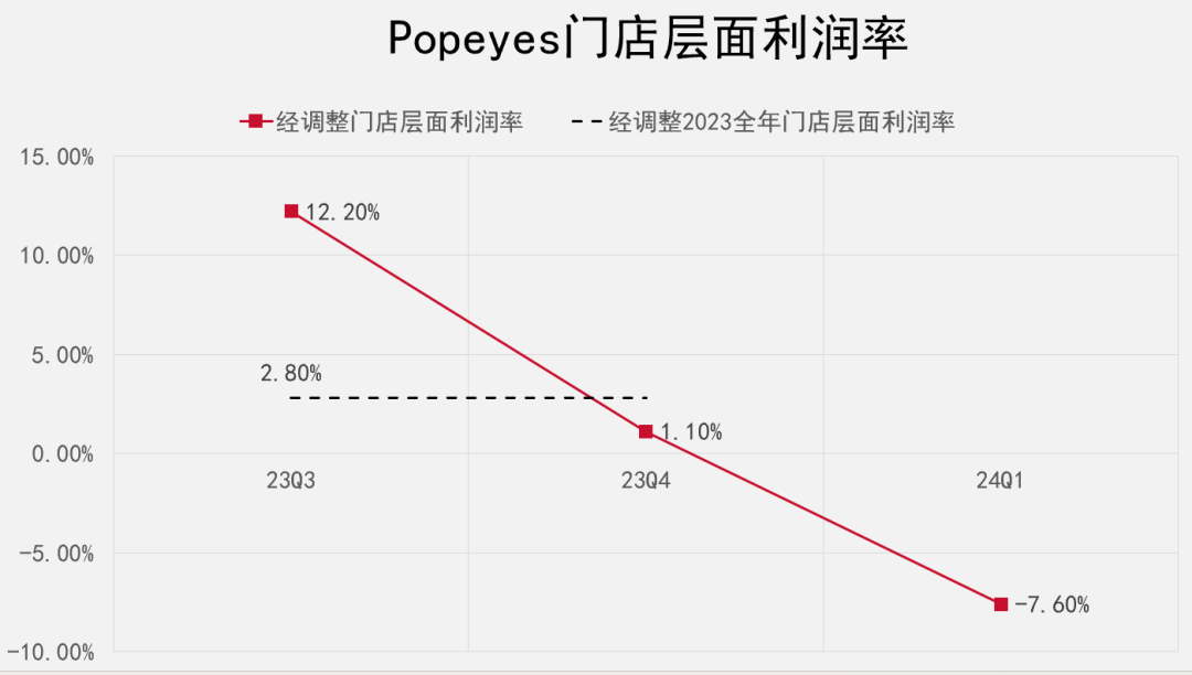 2024年一季度,Popeyes只開(kāi)了1家門店,調(diào)整后門店利潤(rùn)率為-7.6%。門店擴(kuò)張放緩,利潤(rùn)率進(jìn)一步下降。