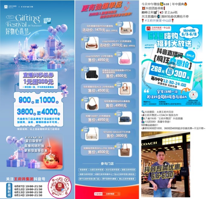 本次好物心選節(jié)期間,集團(tuán)與抖音本地生活官方合作,充分利用平臺(tái)的活動(dòng)資源,組織重點(diǎn)門(mén)店參與618抖音直播大促活動(dòng),并與重點(diǎn)品牌COACH達(dá)成獨(dú)家合作,聯(lián)動(dòng)王府井集團(tuán)雙安商場(chǎng)、長(zhǎng)沙1店、成都1店、成都2店、佛山店、包頭1店、洛陽(yáng)1店、西寧1店、西寧3店、太原店共10家門(mén)店開(kāi)展專(zhuān)場(chǎng)直播。于此同時(shí),賦能門(mén)店直播能力,力保直播GMV產(chǎn)出。