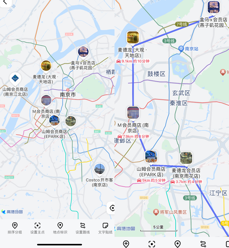 從位置上看,各個(gè)倉(cāng)儲(chǔ)會(huì)員超市遍布各個(gè)區(qū),僅山姆會(huì)員商店(EPARK店)和麥德龍(雨花店)位于同一區(qū)內(nèi),且二者為強(qiáng)競(jìng)爭(zhēng)關(guān)系——彼此距離不超過5公里,開車5分鐘即可到達(dá)。