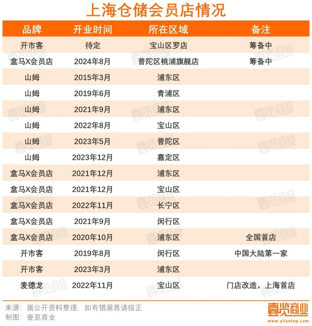 實(shí)際上,南京并不是倉(cāng)儲(chǔ)會(huì)員店們的第一次交鋒,上一個(gè)戰(zhàn)場(chǎng)在上海。截至2024年6月,上海至少有13家倉(cāng)儲(chǔ)會(huì)員超市在營(yíng),2家倉(cāng)儲(chǔ)會(huì)員超市正在籌建,1家倉(cāng)儲(chǔ)會(huì)員超市正在改造。這意味著,上海至少有16家倉(cāng)儲(chǔ)會(huì)員超市。
