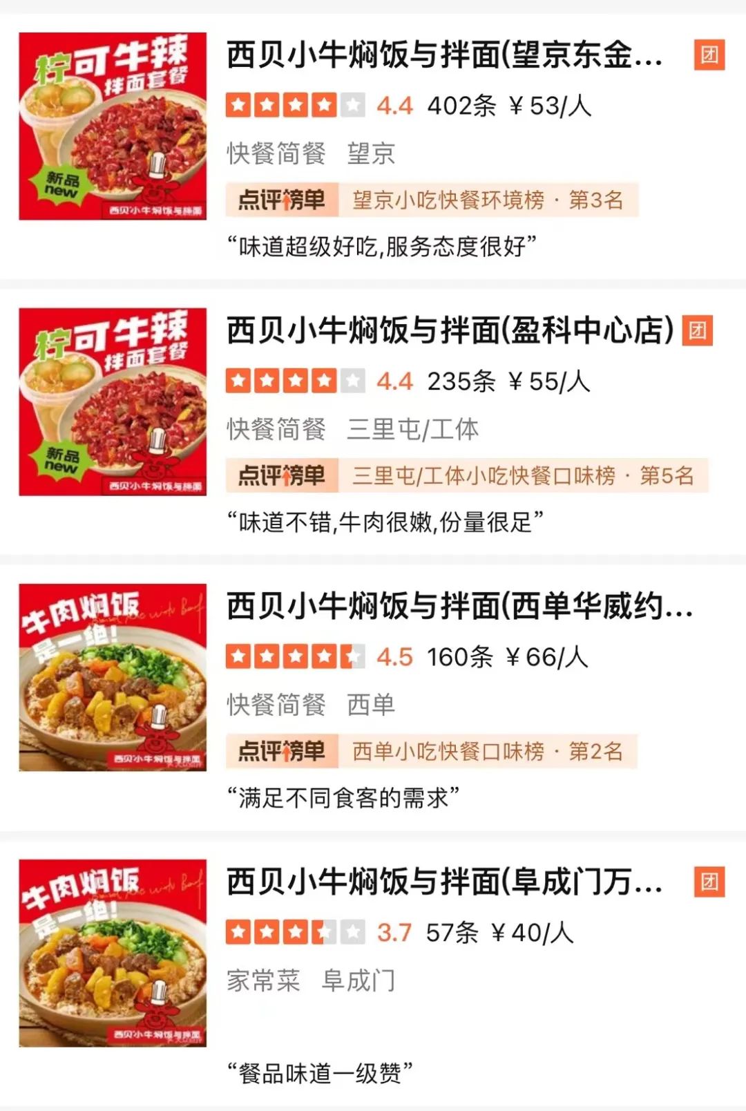 目前,“西貝小牛燜飯與拌面”在北京開出4家新店,位于三里屯、望京、西單等商圈的寫字樓附近,吸引了許多白領(lǐng)和家庭消費(fèi)人群前來就餐。顧客紛紛評(píng)價(jià):“味道不錯(cuò)”“很適合白領(lǐng)工作日解飽”“適合跟家人朋友來吃”……