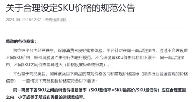 今年4月,抖音電商再度發(fā)布公告,對(duì)商家不合理設(shè)置SKU價(jià)格進(jìn)行專項(xiàng)治理。