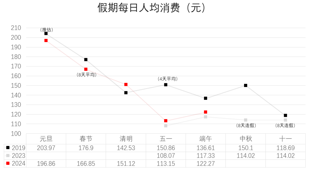 若均攤到每一天,可以看到,從去年五一至今,僅在清明節(jié)人均消費超過2019年同期水平。