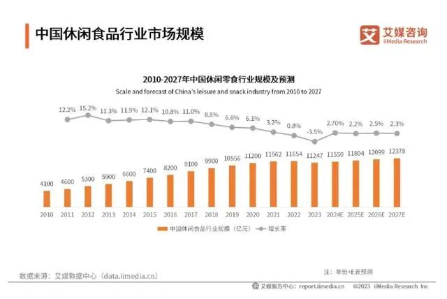 艾媒咨詢數(shù)據顯示,預計今年休閑零食行業(yè)規(guī)模為1.12萬億元,同比下降3.5%,預計2024年市場規(guī)模達到1.16萬億元,同比增長2.70%。
