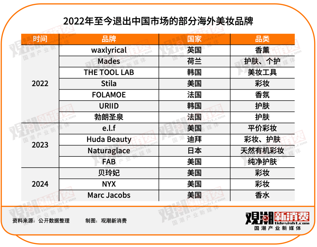 據(jù)不完全統(tǒng)計(jì),2022年至2024年5月,已有20余個(gè)海外美妝品牌退出中國(guó)市場(chǎng),其中涵蓋悅詩(shī)風(fēng)吟、美寶蓮、e.l.f.等知名品牌。 它們或曾在中國(guó)市場(chǎng)風(fēng)靡一時(shí),或盤(pán)踞中國(guó)市場(chǎng)多年,但最終都倒在了這一曾經(jīng)的風(fēng)光市場(chǎng)。