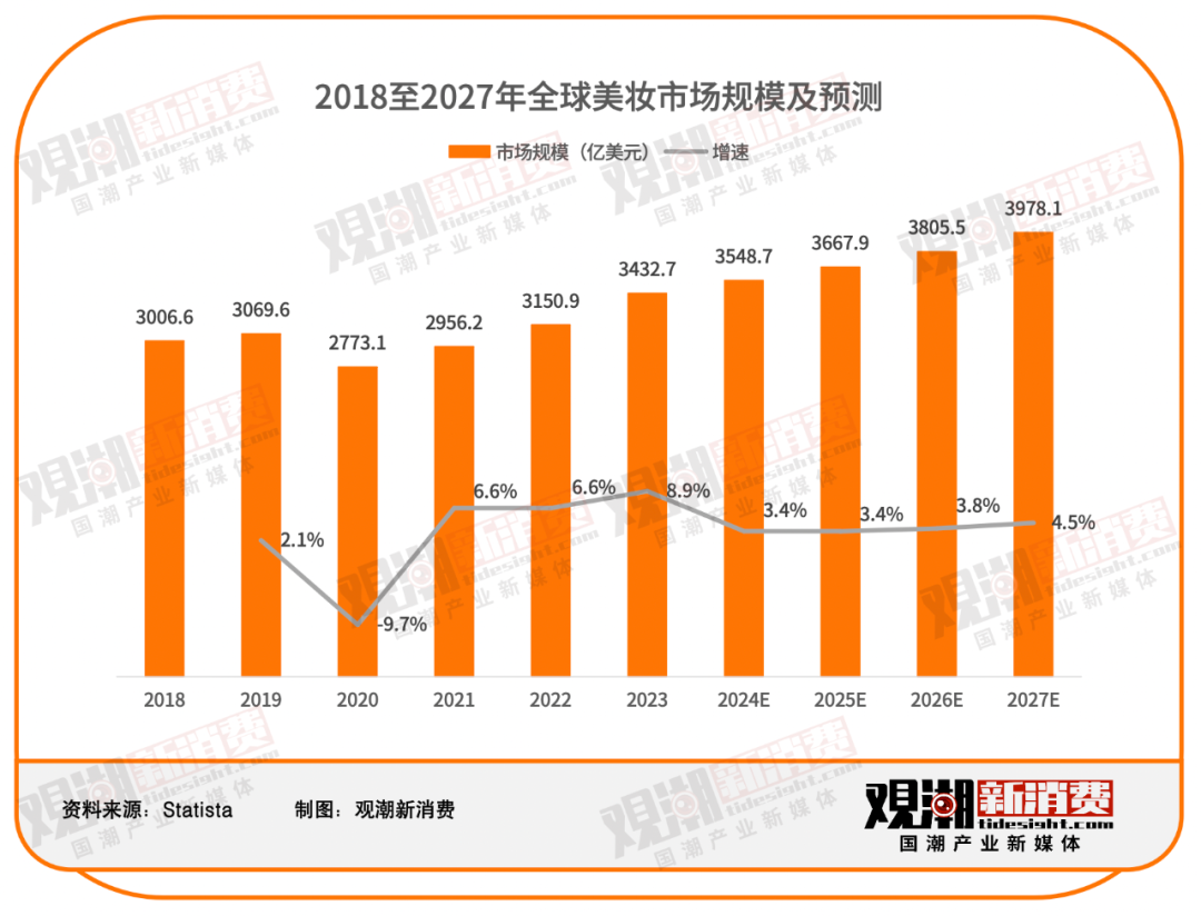 市場(chǎng)競(jìng)爭(zhēng)激烈,海外品牌敗走,國(guó)貨品牌們也打起了反攻戰(zhàn)。 根據(jù)Statista數(shù)據(jù),2023年,全球美妝市場(chǎng)規(guī)模達(dá)3432.7億美元,同比增速達(dá)到8.9%。據(jù)預(yù)測(cè),2027年全球美妝市場(chǎng)規(guī)模將近4000億美元。