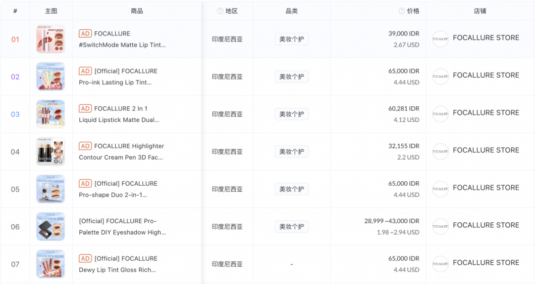供應(yīng)鏈的優(yōu)勢(shì),不僅僅在于助力產(chǎn)品的快速迭代,同時(shí)還可以將成本壓縮到極致,提供高性價(jià)比產(chǎn)品。根據(jù)GoodsFox顯示,對(duì)比歐萊雅彩妝7-15美元的價(jià)格,F(xiàn)OCALLURE印尼小店熱銷(xiāo)單品的售價(jià)均在5美元以下,高性價(jià)比是品牌在東南亞一些人均GDP較低的國(guó)家快速產(chǎn)生裂變效應(yīng)的重要因素。