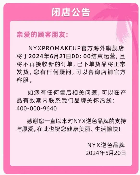 近日,美國(guó)彩妝品牌NYX在其天貓旗艦店發(fā)布的公告顯示,“旗艦店將于2024年6月21日零點(diǎn)結(jié)束運(yùn)營(yíng),且將不再接受新的訂單!
