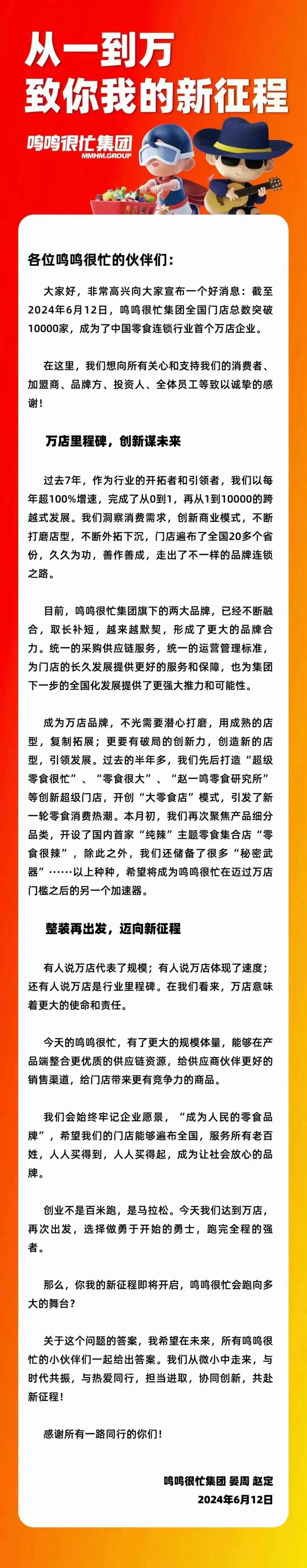 在破萬店之際,鳴鳴很忙對外表示,“萬店”是里程碑,卻不是終點。