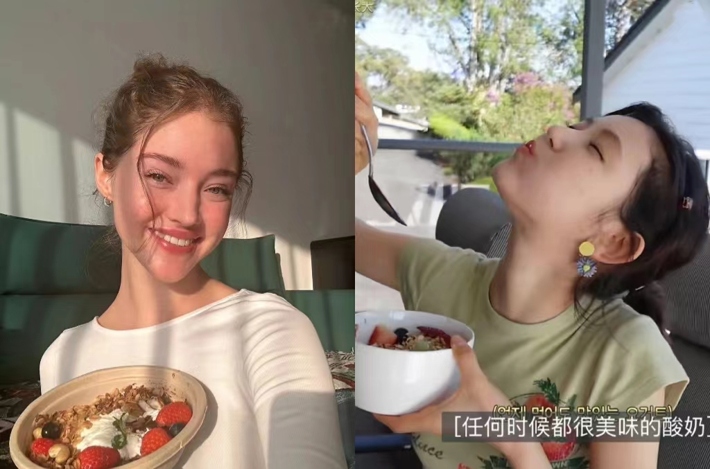國內(nèi)對酸奶碗的定義可以參考這個制作公式:酸奶碗=希臘酸奶+烘焙麥片+食物粉(增添顏色與風(fēng)味)+水果+topping(點(diǎn)綴物),元素多樣、成分講究、看起來既美貌又健康,像是身材緊致的白女博主或者南韓愛豆 vlog 里會端出來的食物。