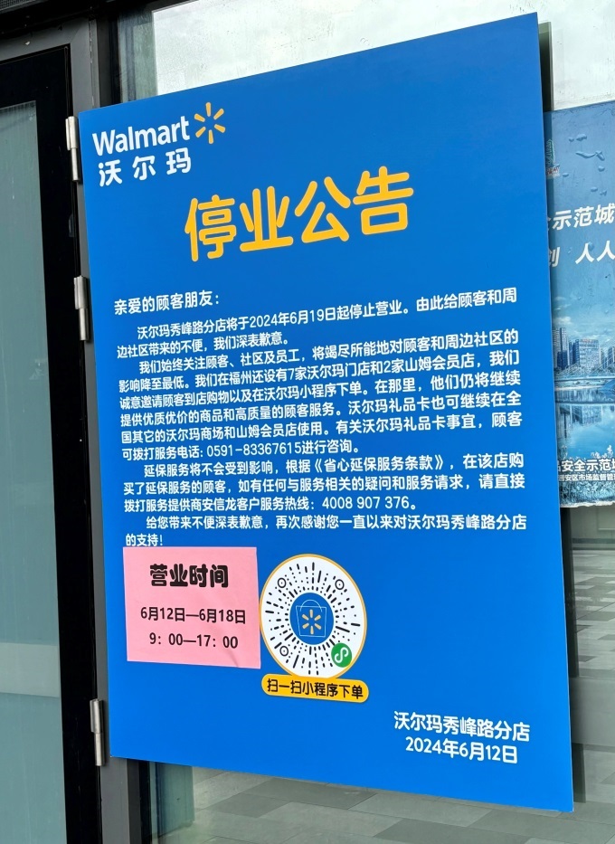 聯(lián)商快訊:6月12日,福州五四北泰禾廣場的“沃爾瑪秀峰路分店”發(fā)布停業(yè)公告,宣布將于2024年6月19日起停止營業(yè)。