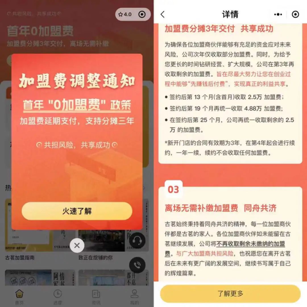2024年3月29日起,古茗實行首年“0加盟費”政策,加盟費共計9.88萬,加盟費可分攤3年支付。如果中途離場,無需補繳加盟費,不再收取剩余未繳納的加盟費。官方給出的前期總預算23萬起,不包含租金、轉讓費、加盟費。