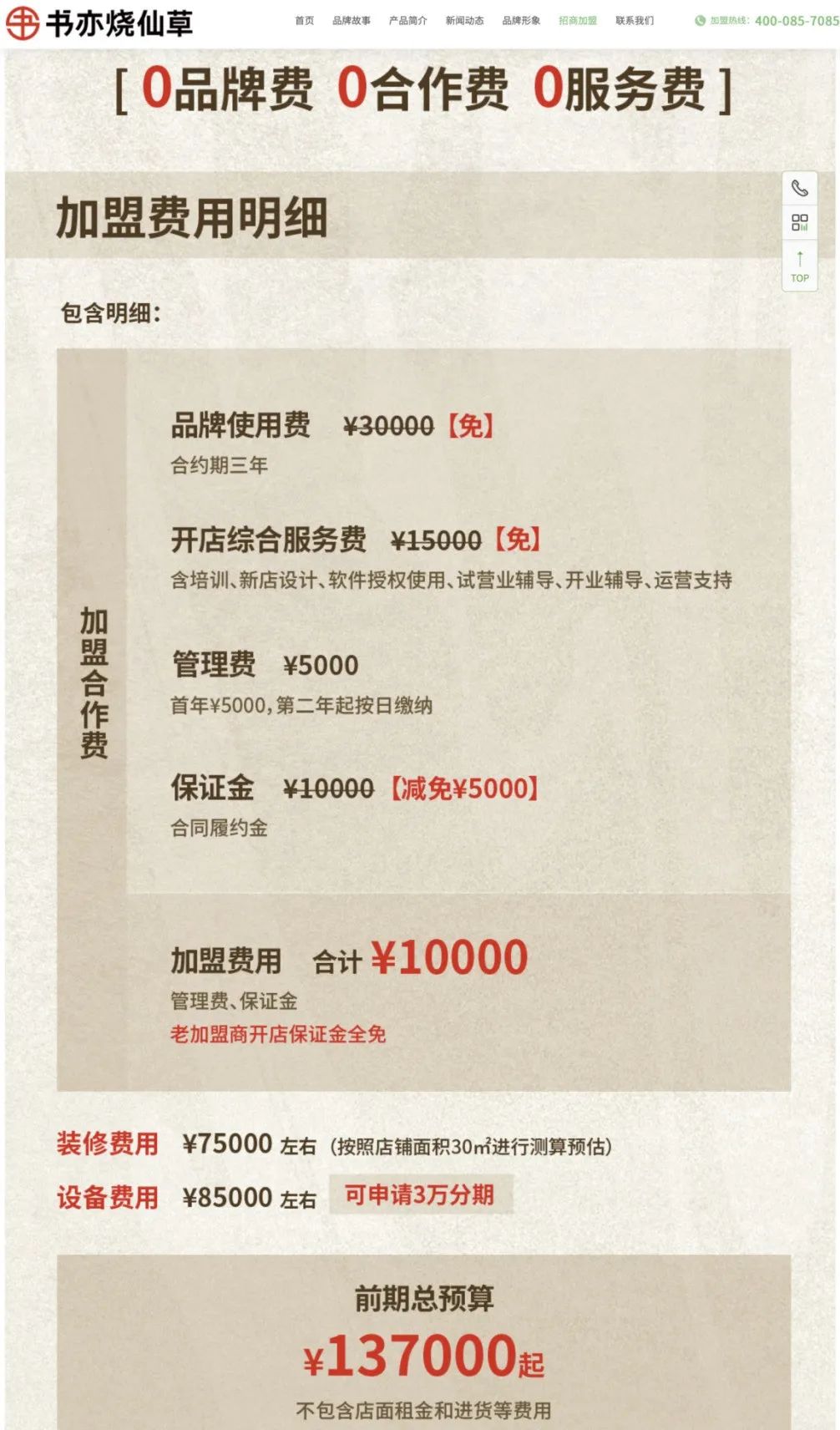 書亦燒仙草也發(fā)布了新版加盟政策,除0品牌費、0服務費,新老加盟商均可申請設備費分期支付,分期額度最高可申請至3萬元,官方給出的前期總預算14萬起,不包含租金和進貨等費用。