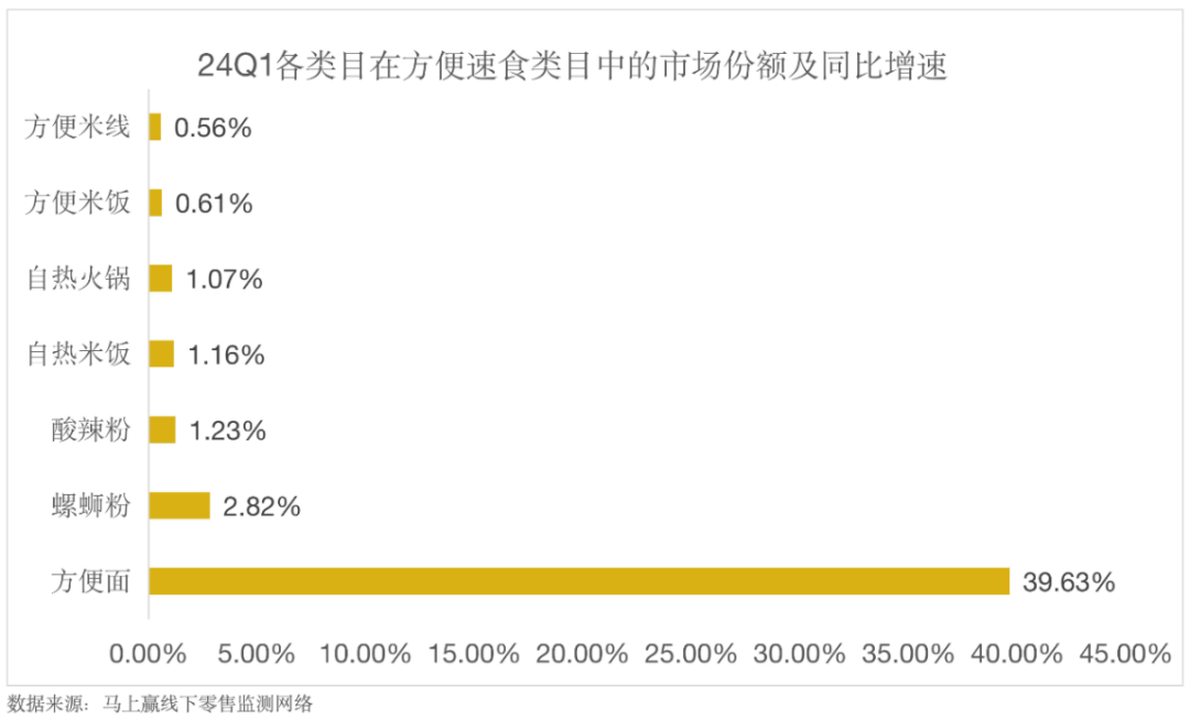 雖然方便面市場的增長紅利已逐漸消退,已不復當年盛況,但就整體大盤而言,方便面在速食市場占有率維持在30-40%的階段,依然處于“遙遙領先”的狀態(tài)。