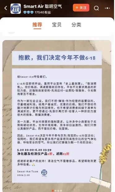 “抱歉,我們決定今年不做618了!苯,Smart Air聰明空氣在店鋪首頁發(fā)布不參加618大促的公開信。
