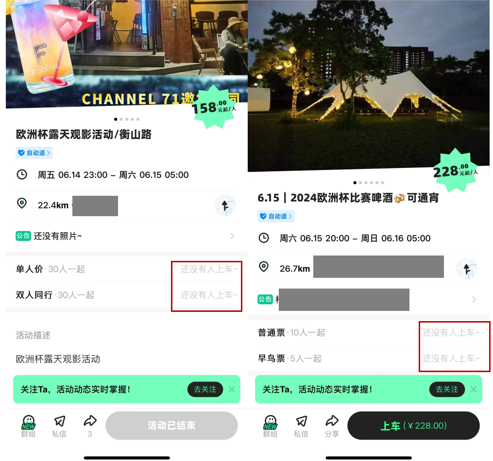 近日就有商家和愛好者在組隊小程序上發(fā)布揭幕戰(zhàn)「暢飲觀賽」的活動,但報名上車人數(shù)為0,其他日期的露營觀賽參與人數(shù)也不佳。