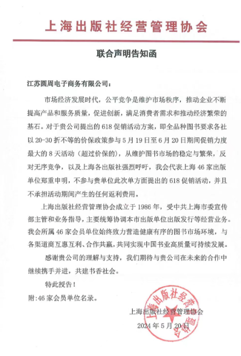 在5月20日這天,北京10家出版社和上海出版社經(jīng)營管理協(xié)會代表上海46家出版單位聯(lián)合發(fā)表“聯(lián)合聲明告知函”,明確拒絕參與此次促銷活動,并不承擔(dān)活動期間產(chǎn)生的任何返利費(fèi)用。