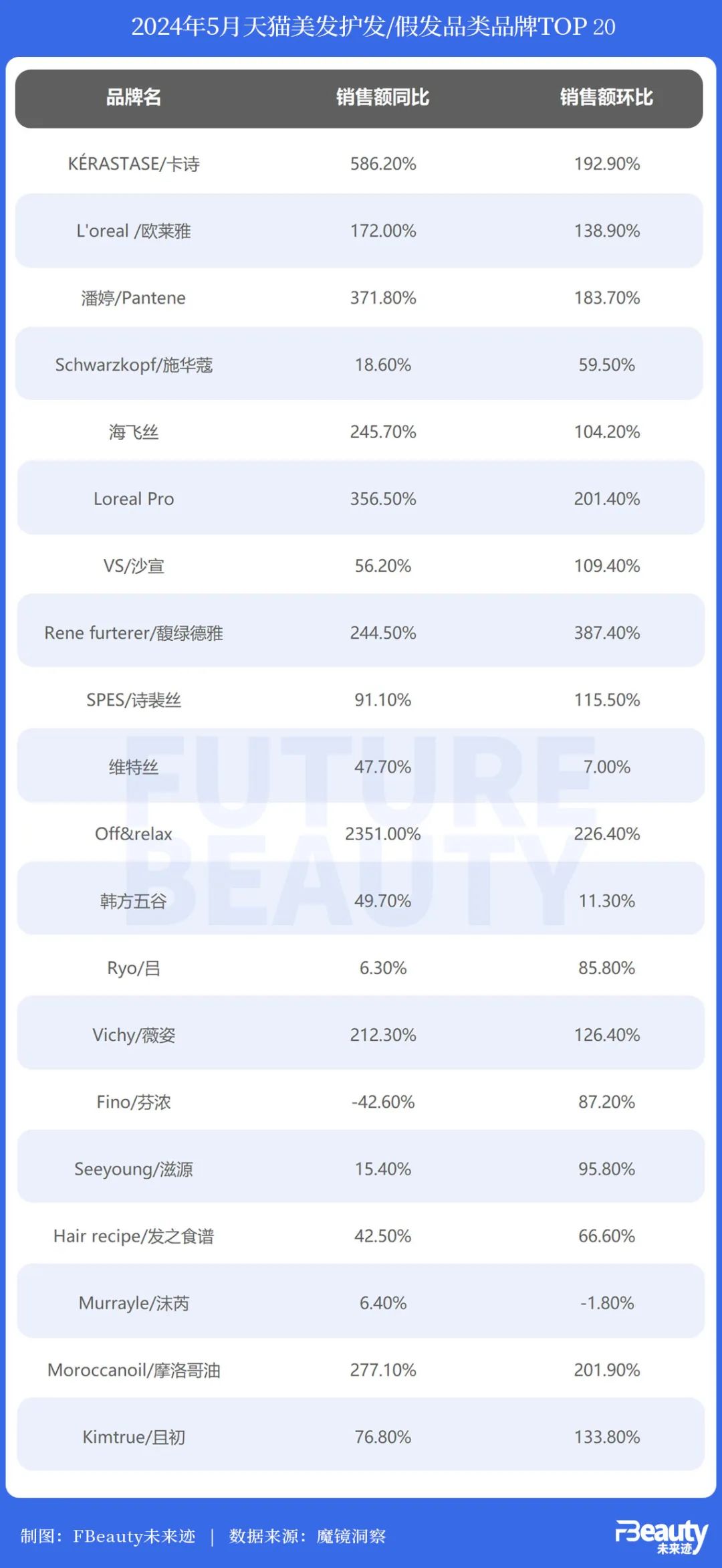 從美發(fā)護發(fā)/假發(fā)品類來看,品牌銷售額前三名分別為卡詩、歐萊雅、潘婷,這三個品牌的5月天貓銷售額達到億元規(guī)模。其中卡詩以同比增長586.2%、環(huán)比增長192.9%的成績登頂,這也是唯一銷售額突破2億規(guī)模的品牌。此外,在品牌前二十中也僅有個別品牌出現(xiàn)同比下滑,其余品牌都保持了上升趨勢。