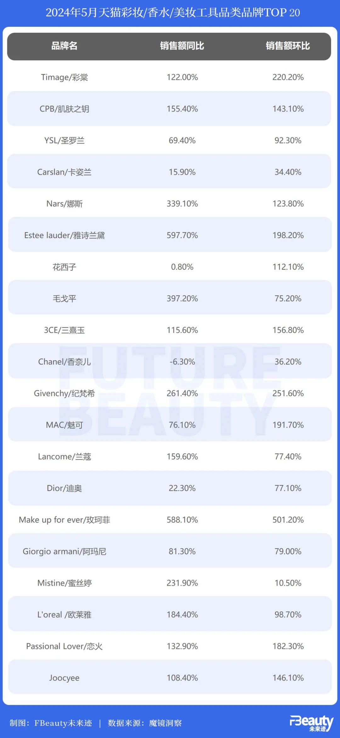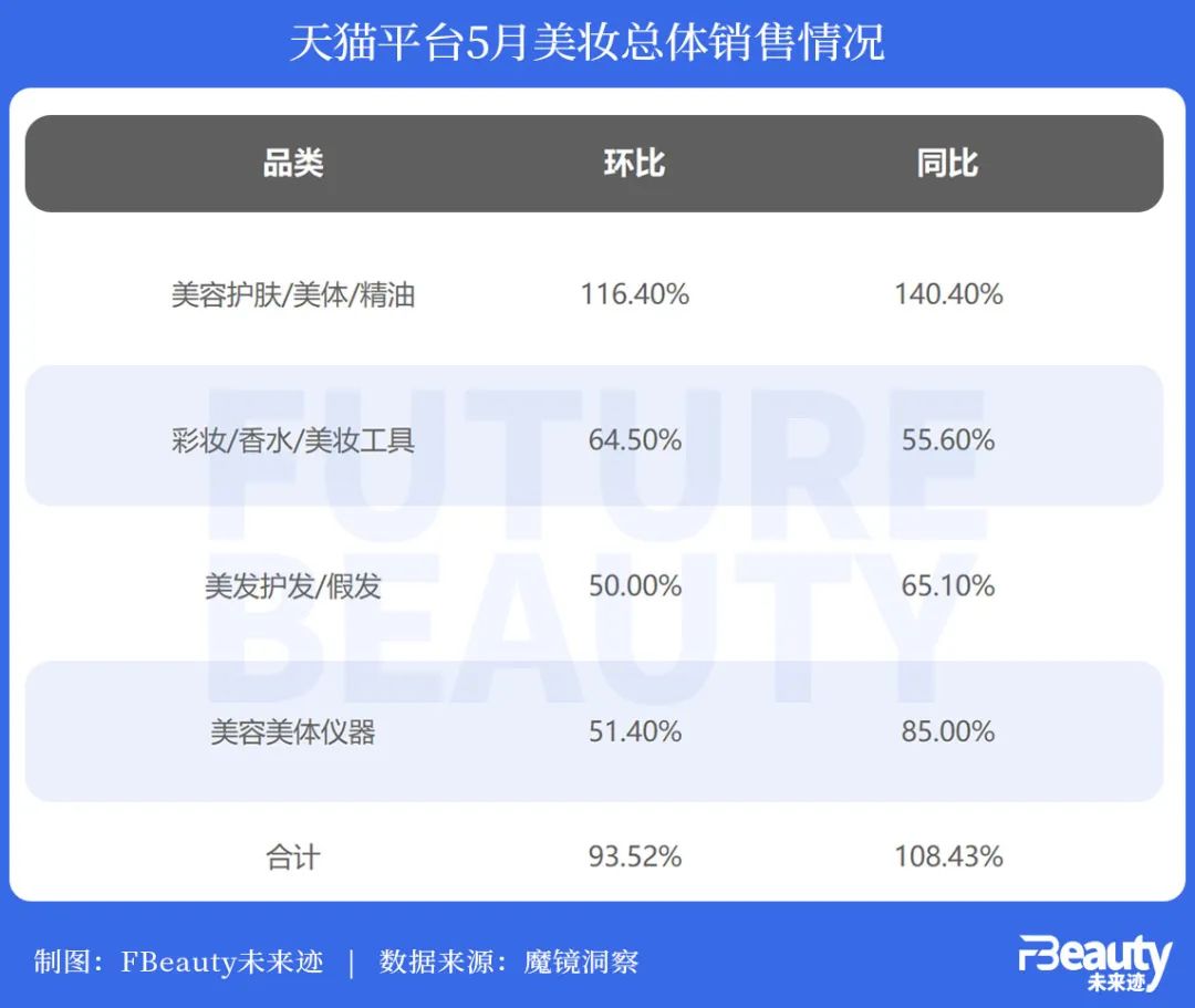 《FBeauty未來跡》從魔鏡洞察獲取到的數(shù)據(jù)顯示,單從天貓平臺來看,5月的美妝銷售總體增勢更為迅猛,同比增長108.43%、環(huán)比增長93.52%,相較去年5月整整翻了一番。