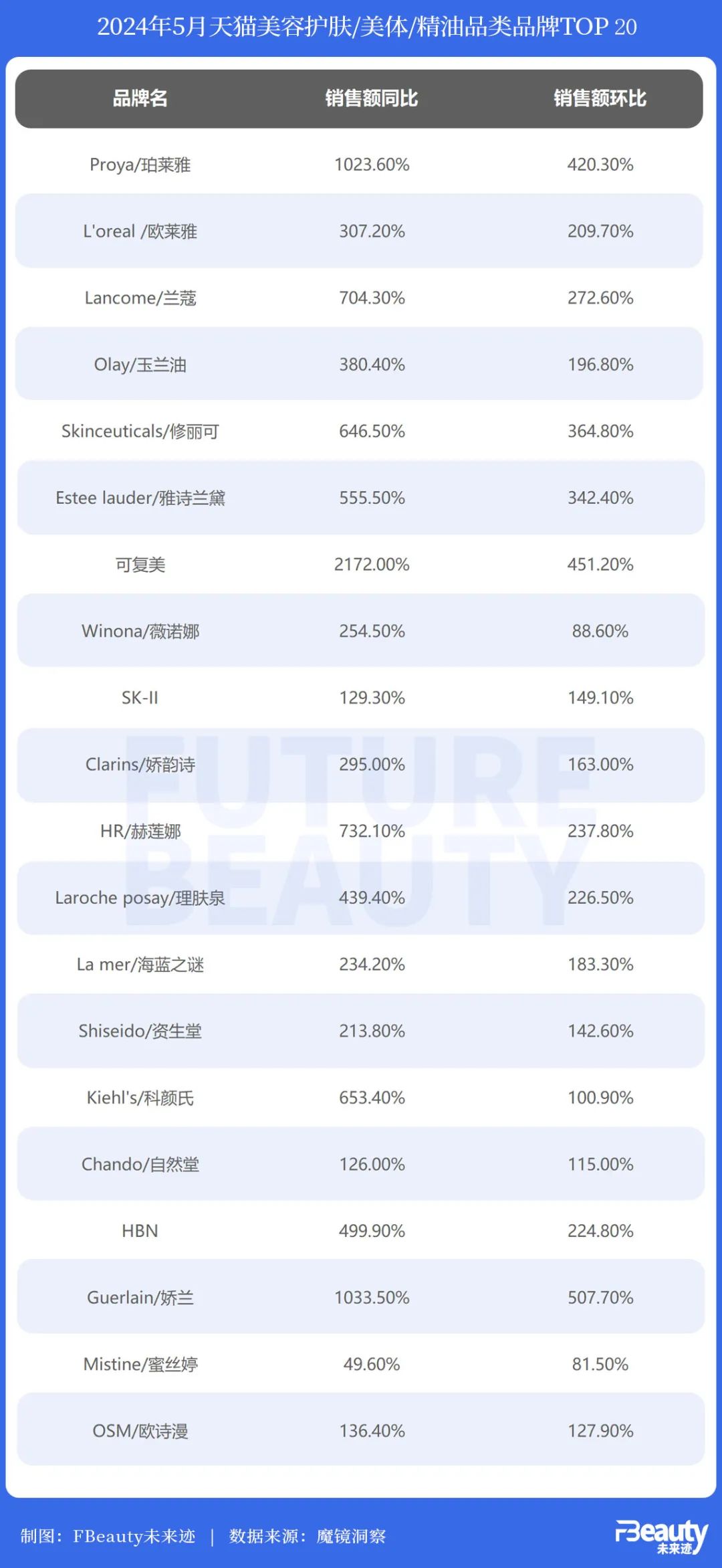 魔鏡洞察數(shù)據(jù)顯示,5月天貓美容護膚/美體/精油品類品牌排名中,國貨品牌珀萊雅以同比增長1023.6%、環(huán)比增長420.3%的驚人漲幅位居品牌榜第一。