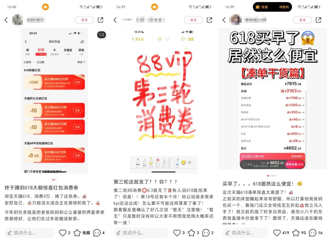 擁有更長時間決策的消費者,自然能算出何種方式購買更加實惠。在社交媒體平臺可以發(fā)現(xiàn),以往消費者在618談?wù)摰亩际菐c去蹲哪個直播間,現(xiàn)在都變成了如何領(lǐng)取大額消費券、什么時候發(fā)放第三波優(yōu)惠券、怎樣疊加購買優(yōu)惠力度最大。