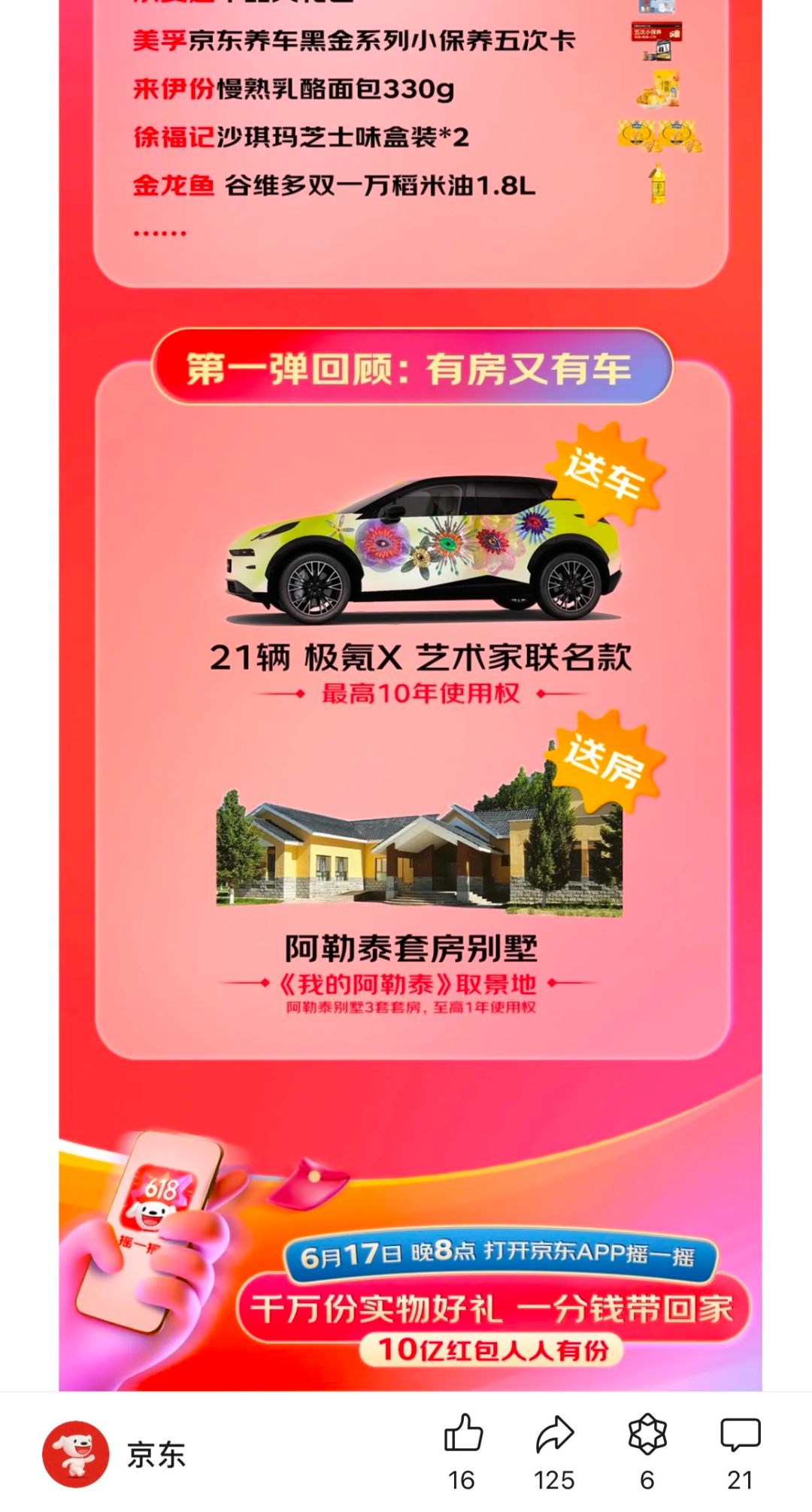 最近京東宣布的《京東618開(kāi)心夜》活動(dòng)中,還有抽獎(jiǎng)“送房”“送車(chē)”的操作,具體為21輛極氪汽車(chē)的10年使用權(quán),阿勒泰別墅3套套房1年使用權(quán),同時(shí)也還有其他電子產(chǎn)品。