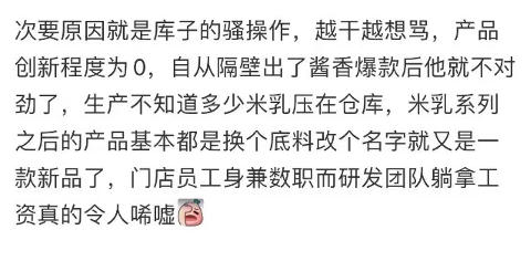 結合此前在庫迪門店前員工曝出的“換個底料改個名字就是一款新品”,也就不難理解庫迪為何未能捧出爆品、摘不掉“難喝”標簽。