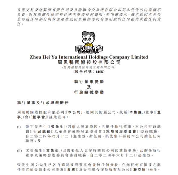 6月12日晚,周黑鴨(1458.HK)發(fā)布了一系列人事變動公告。核心變動為,原執(zhí)行董事行政總裁及董事會策略發(fā)展委員會委員張宇晨,因個人發(fā)展原因辭任,周富裕重回一線,接任張宇晨。就在前一天,周富裕在社交視頻平臺公開稱“周黑鴨要重回經(jīng)典!