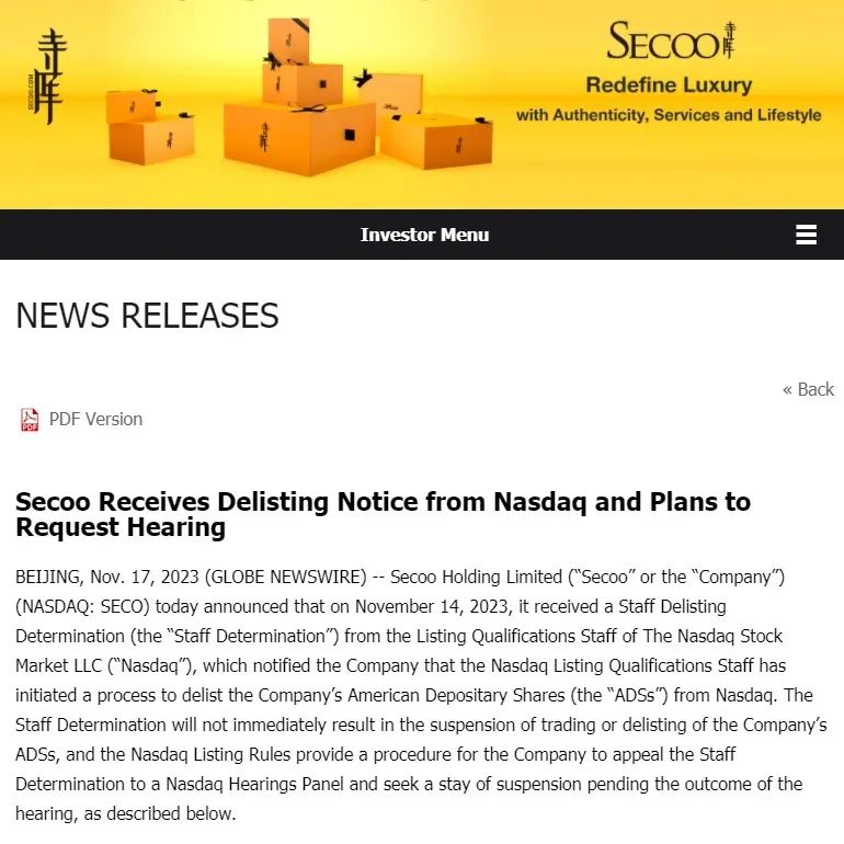 同年,中國唯一的奢侈品電商上市公司寺庫被納斯達(dá)克啟動退市程序,其命運(yùn)同樣堪憂。