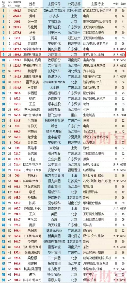 最新富豪榜出爐,王健林父子以1406億元的總身家,重新回歸前十。