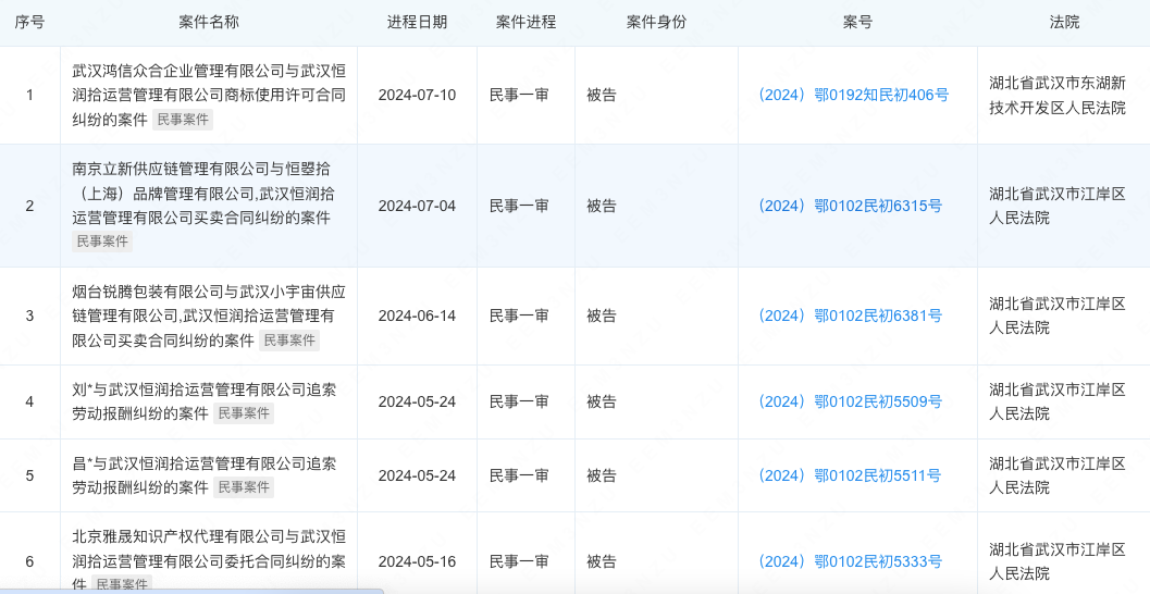 企查查信息顯示,漢口二廠所屬的武漢恒潤(rùn)拾運(yùn)營(yíng)管理有限公司(以下簡(jiǎn)稱“武漢恒潤(rùn)拾”),目前共涉46樁作為被告的司法案件,其中,2023年后明顯增多,集中于合作企業(yè)要求履約(多是欠賬)的合同糾紛,以及公司員工討薪的勞動(dòng)爭(zhēng)議。
