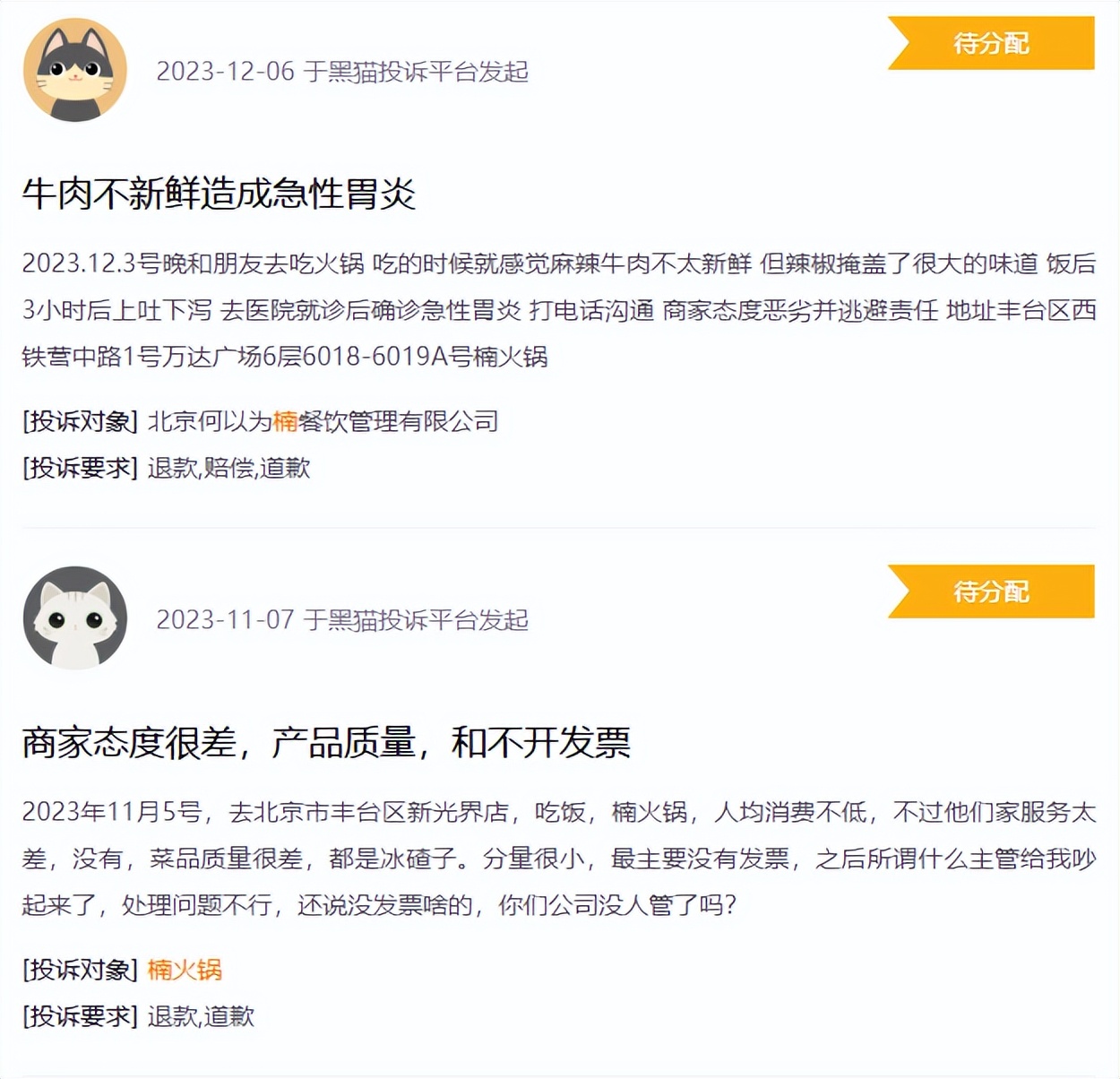 去年,楠火鍋回龍觀店被曝出存在把發(fā)酸豬蹄用開水沖洗后繼續(xù)使用、豬蹄長毛發(fā)綠后才丟棄以及食材掉到地上后繼續(xù)使用等問題。隨后,北京市昌平區(qū)市場監(jiān)管局又發(fā)現(xiàn)該店還存在生熟食品混放、食品調(diào)味料過期等問題,并立案調(diào)查。黑貓投訴平臺上,也有網(wǎng)友投訴楠火鍋牛肉不新鮮導(dǎo)致急性胃炎、調(diào)料區(qū)有飛蟲、蝦滑有怪味……