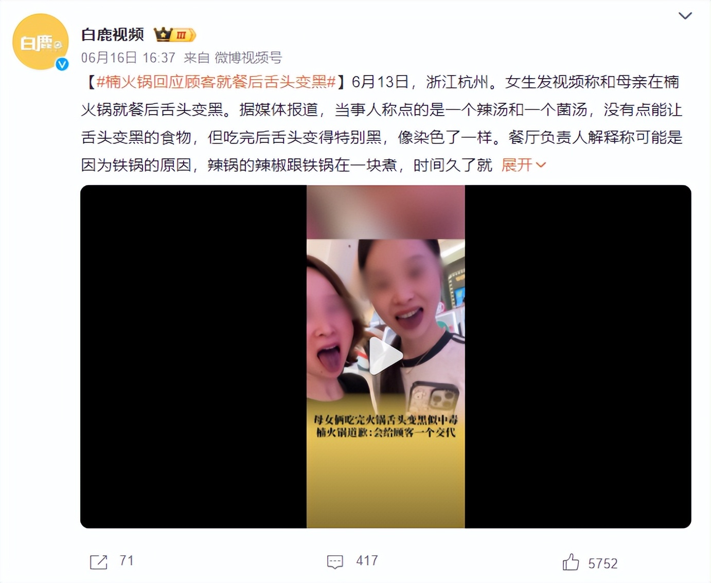 據(jù)媒體報道,該網(wǎng)友稱,當天吃了牛蛙、土豆、豆芽、鹵豬蹄、雞腳、鹵肥腸等不應(yīng)該會導(dǎo)致染色的食物。當時,火鍋負責(zé)人說,舌頭變黑可能是因為鐵鍋。但是6月15日,楠火鍋官方賬號在該網(wǎng)友的評論區(qū)做出了回應(yīng),表示工作人員做出的回復(fù)不實,將安排博主及同行人去醫(yī)院檢查,并將鍋底樣品送檢,給所有顧客一個交代。事情引發(fā)關(guān)注后,有多位網(wǎng)友表示自己也遇到過同樣的事情,那時還以為是生病了。